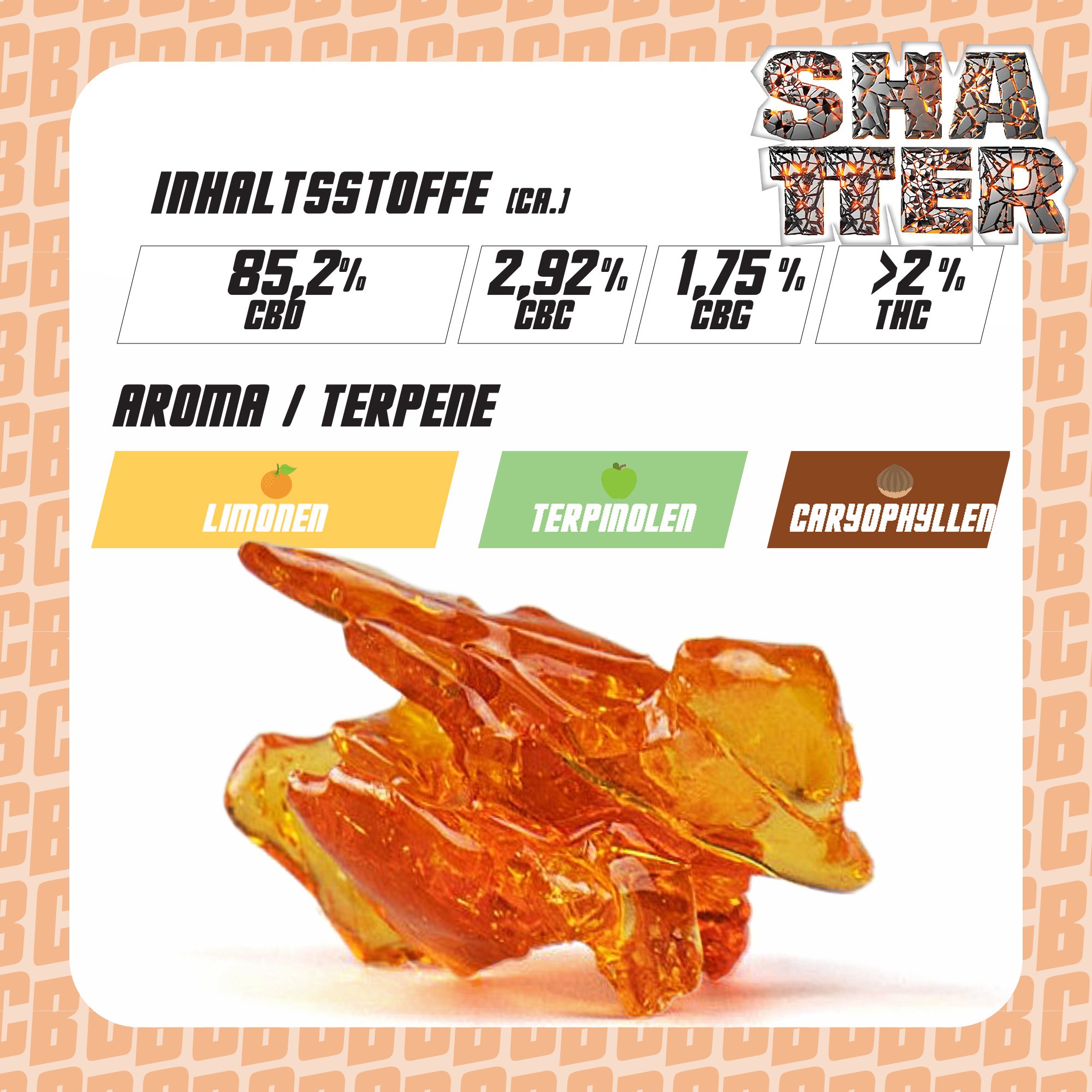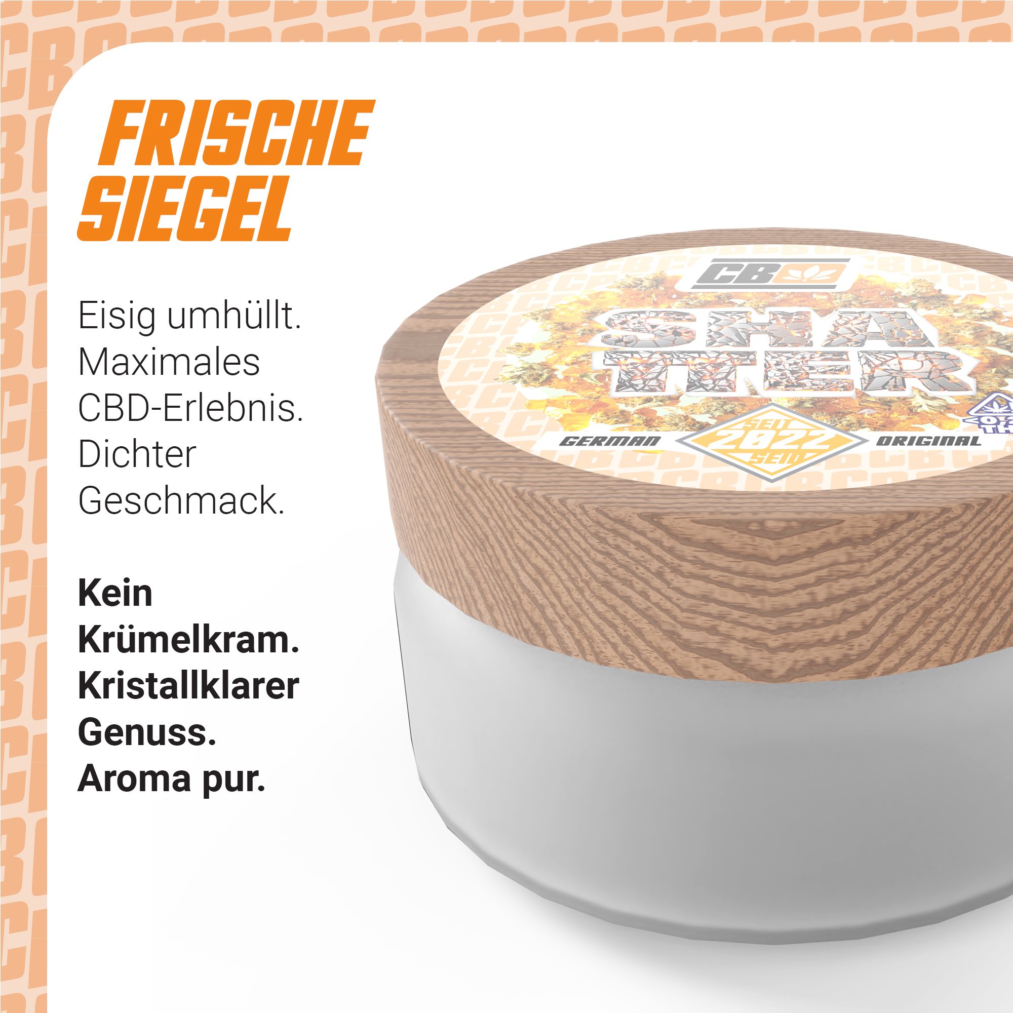 Entdecke die pure Kraft von Shatter CBD-Extrakt! Mit seiner glatten, kristallartigen Struktur und dem hohen CBD-Gehalt bietet Shatter ein außergewöhnlich reines und intensives Erlebnis. Perfekt für alle, die ein konzentriertes Produkt suchen, um maximale Ergebnisse zu erzielen.