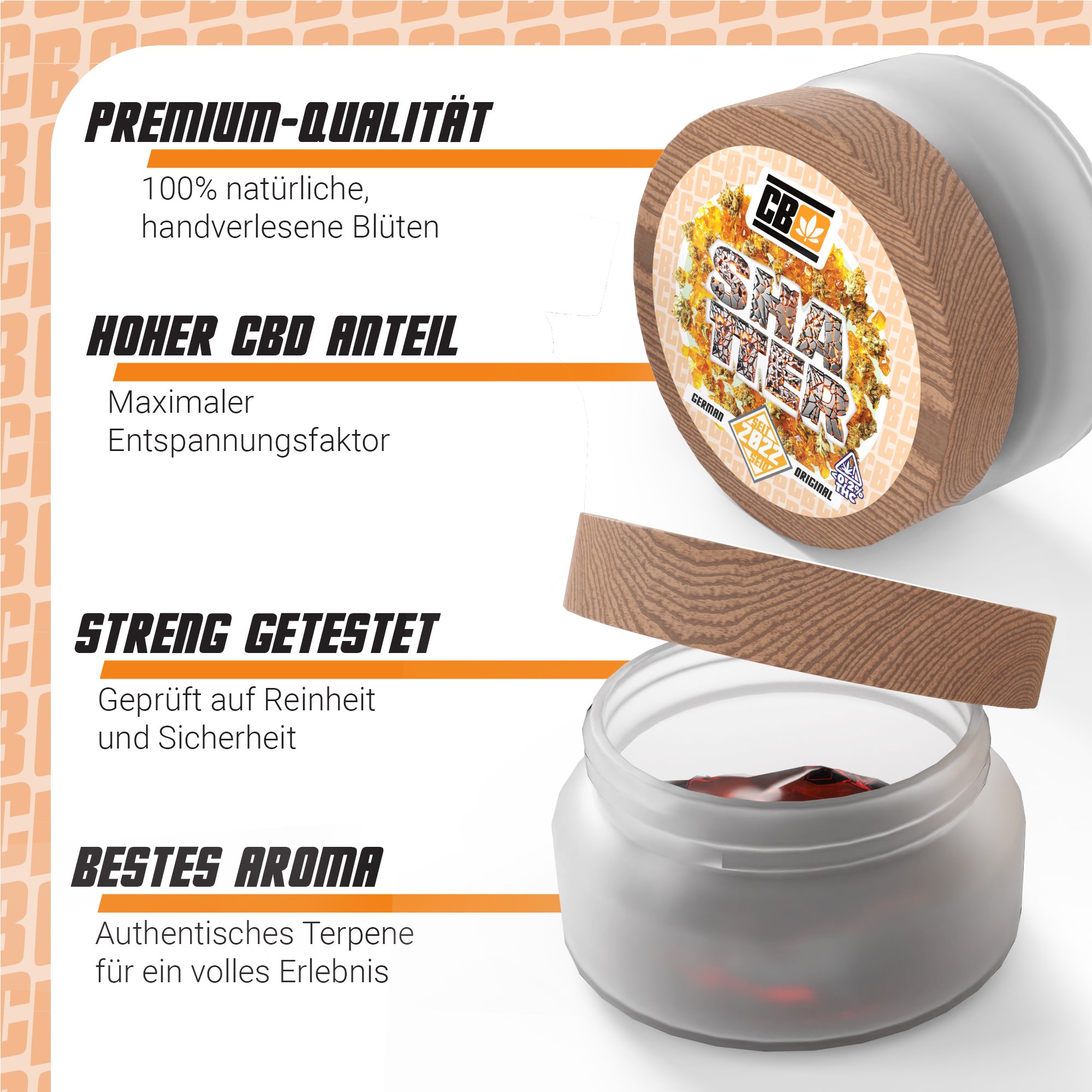 Unser Shatter CBD-Extrakt wird aus sorgfältig ausgewählten CBD-Blüten gewonnen und durch modernste Extraktionsverfahren hergestellt. Das Ergebnis ist ein reines, unverfälschtes Produkt ohne Zusatzstoffe, das höchste Qualitätsstandards erfüllt und ein kraftvolles CBD-Erlebnis garantiert.